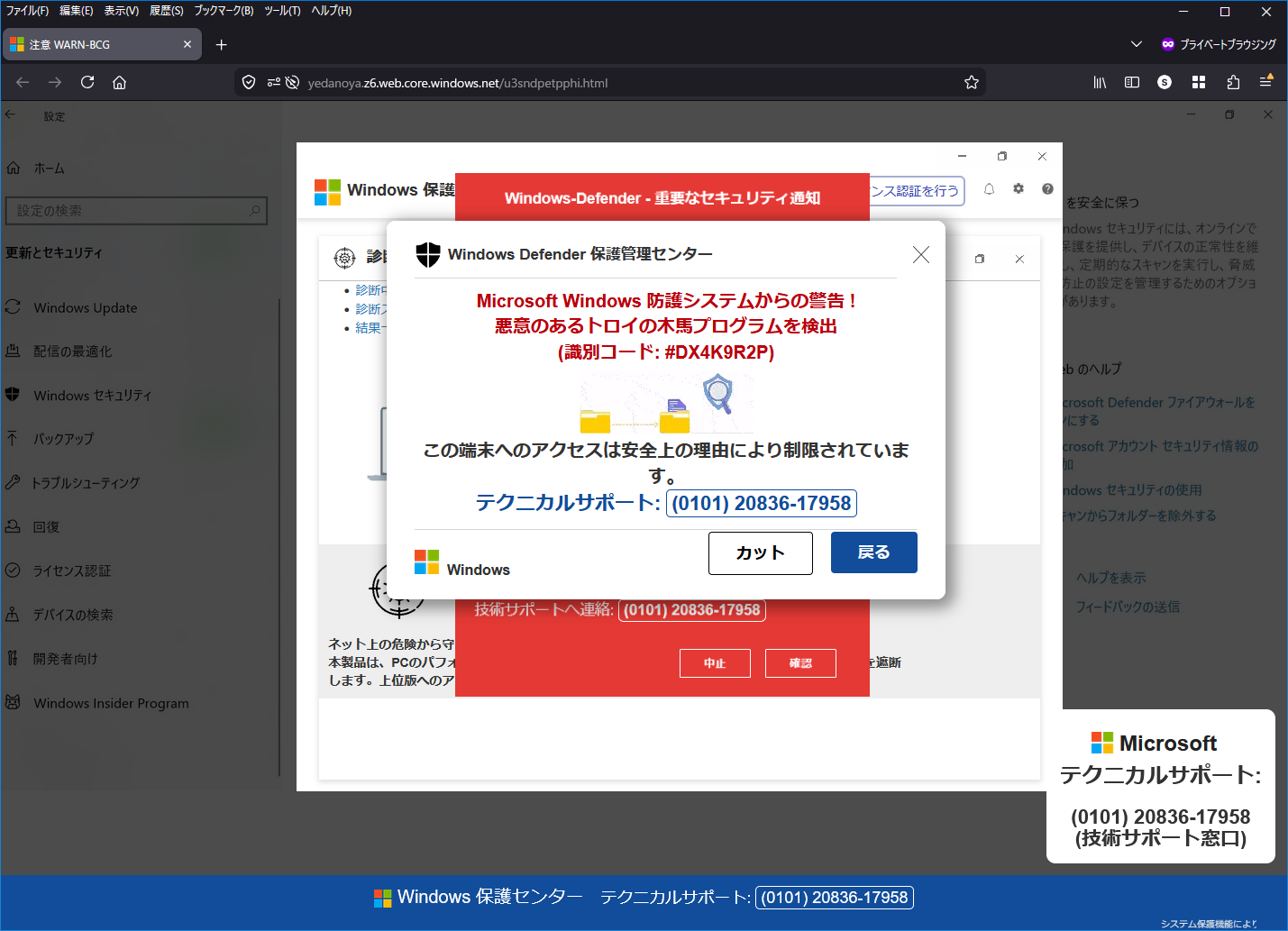 バナーをクリックすると、いつものサポート詐欺へ転送されます。 web.core.windows.net は定番ですね。