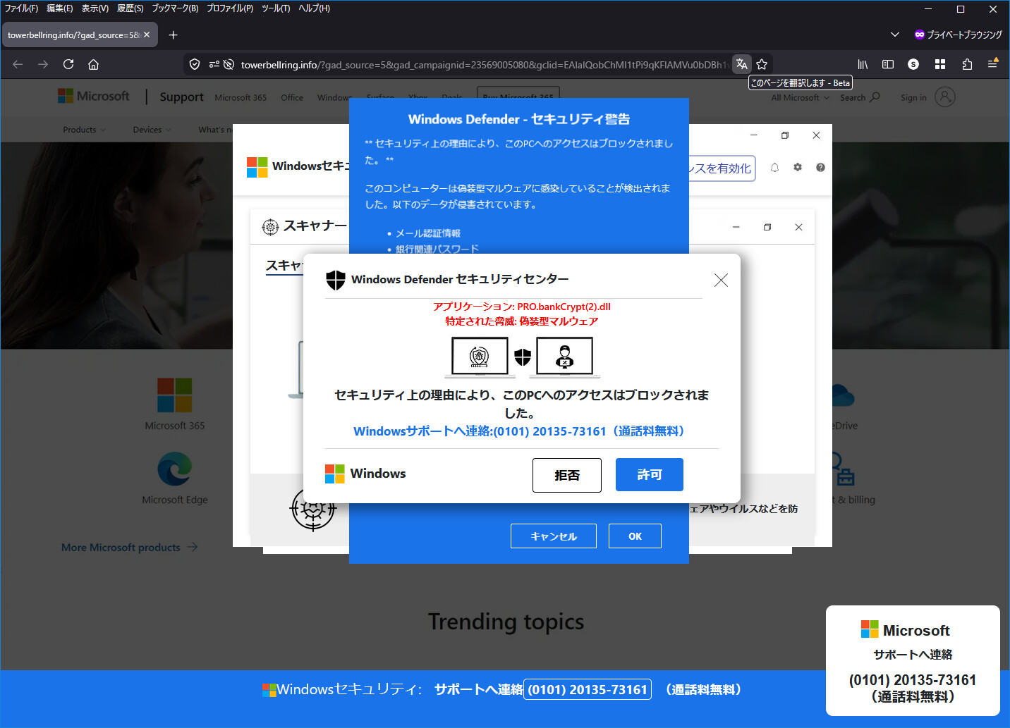 バナーをクリックすると、いつものサポート詐欺へ転送されます。 こちらは引数の最後が_BwEになります。
