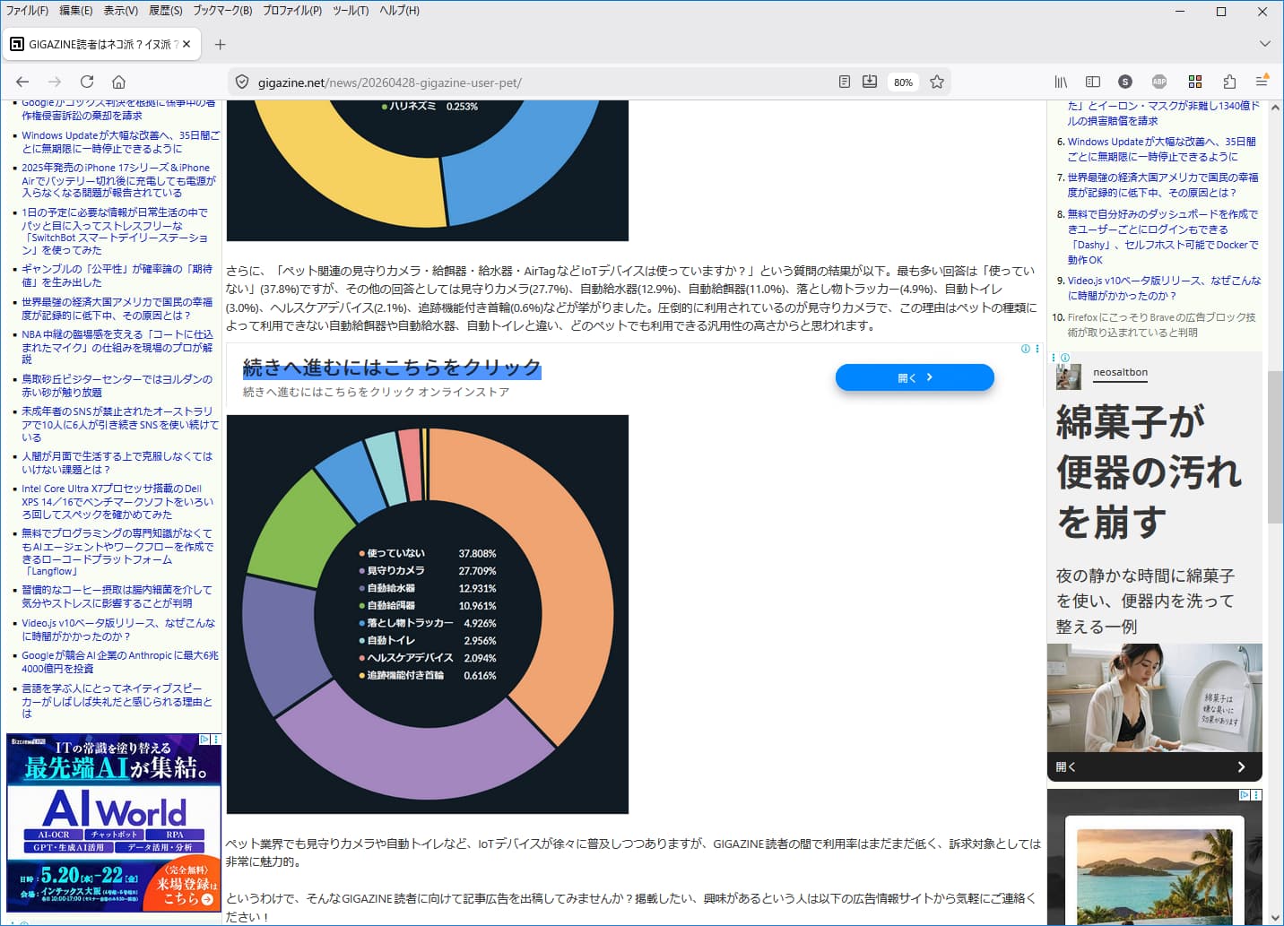 サイト右中央の綿菓子が便器の汚れを崩すと書いてあるバナー
